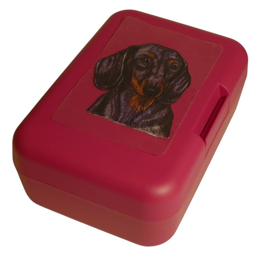 Plastový svačinový box s barevným potiskem jezevčíka hladkosrstého. Boxík je vhodný k uložení nejen klasické svačiny, ale i dalších potravin jako např. sušeného ovoce a oříšků, sušenek a jiných dobrot. Svou velikostí je velmi vhodný dětem do školních aktovek a batohů, do školy i na výlety.