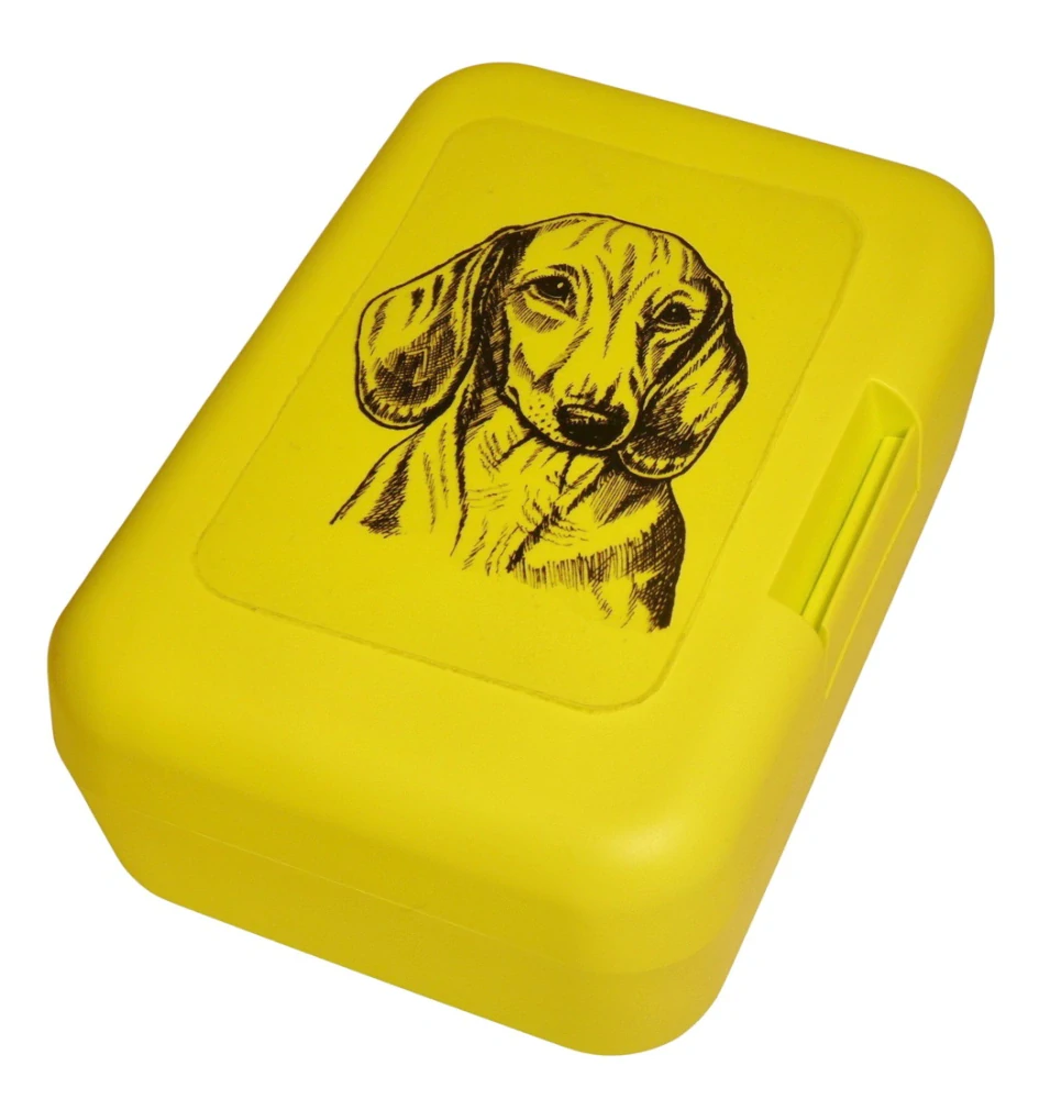 Plastový svačinový box s černobílým potiskem jezevčíka hladkosrstého. Boxík je vhodný k uložení nejen klasické svačiny, ale i dalších potravin jako např. sušeného ovoce a oříšků, sušenek a jiných dobrot. Svou velikostí je velmi vhodný dětem do školních aktovek a batohů, do školy i na výlety.