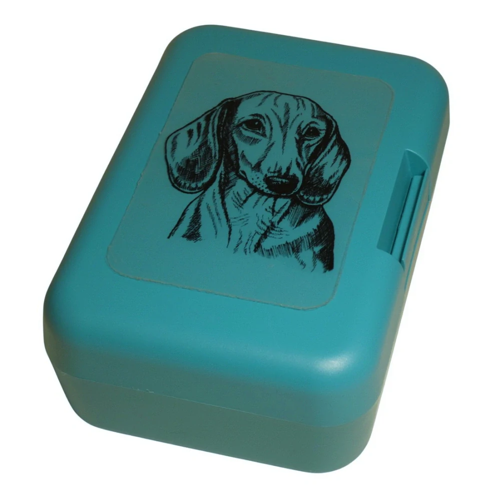 Plastový svačinový box s černobílým potiskem jezevčíka hladkosrstého. Boxík je vhodný k uložení nejen klasické svačiny, ale i dalších potravin jako např. sušeného ovoce a oříšků, sušenek a jiných dobrot. Svou velikostí je velmi vhodný dětem do školních aktovek a batohů, do školy i na výlety.