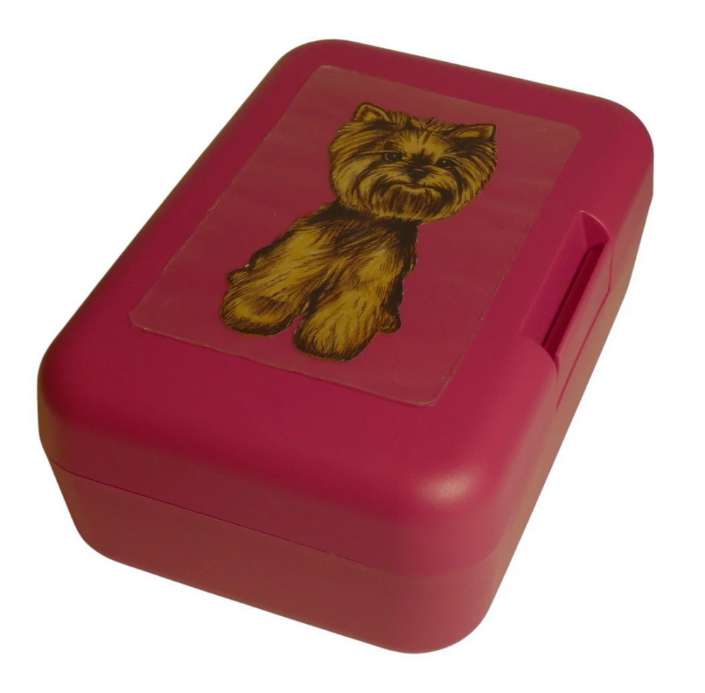 Plastový svačinový box s potiskem ostříhaného jorkšírského teriéra. Vhodný k uložení nejen klasické svačiny, ale i dalších potravin jako např. sušeného ovoce a oříšků, sušenek a jiných dobrot. Svou velikostí je velmi vhodný dětem do školních aktovek a batohů, do školy i na výlety.