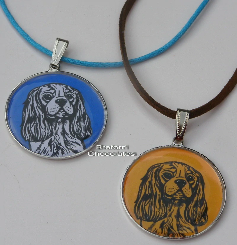 Černobílá perokresba kavalír King Charles španěla s barevným pozadím je na bižuterním lůžku chráněna 3D epoxy pryskyřicí, která je nerozbitná a lehce pruží.