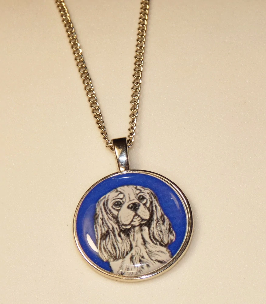 Černobílá perokresba kavalír King Charles španěla s barevným pozadím je na bižuterním lůžku chráněna 3D epoxy pryskyřicí, která je nerozbitná a lehce pruží.