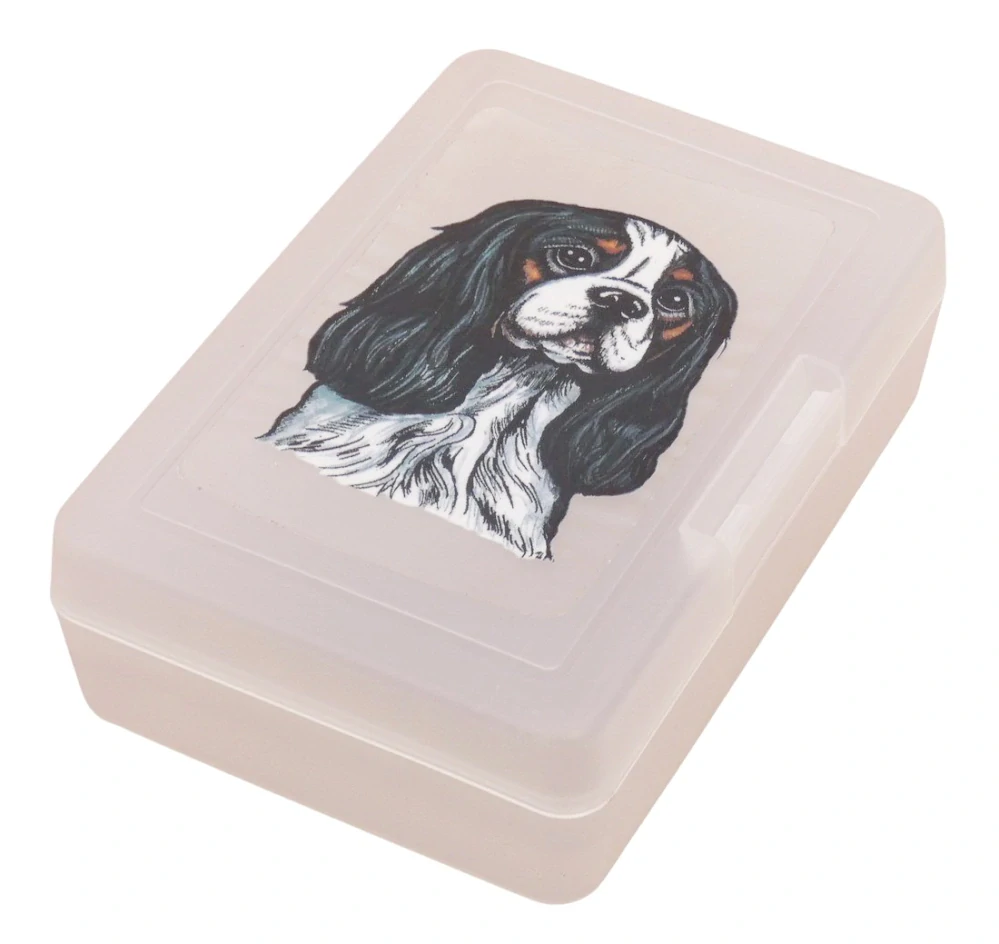 Plastový svačinový box s barevným potiskem psa plemene Kavalír King Charles španěl v barvě tricolor. Vhodný k uložení nejen klasické svačiny, ale i dalších potravin jako např. sušeného ovoce a oříšků, sušenek a jiných dobrot. Svou velikostí je velmi vhodný dětem do školních aktovek a batohů, do školy i na výlety.