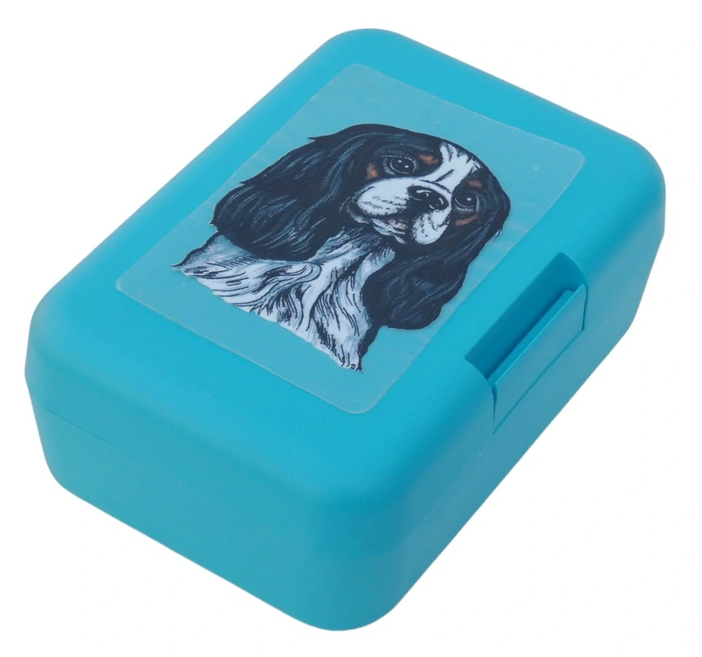 Plastový svačinový box s barevným potiskem psa plemene Kavalír King Charles španěl v barvě tricolor. Vhodný k uložení nejen klasické svačiny, ale i dalších potravin jako např. sušeného ovoce a oříšků, sušenek a jiných dobrot. Svou velikostí je velmi vhodný dětem do školních aktovek a batohů, do školy i na výlety.