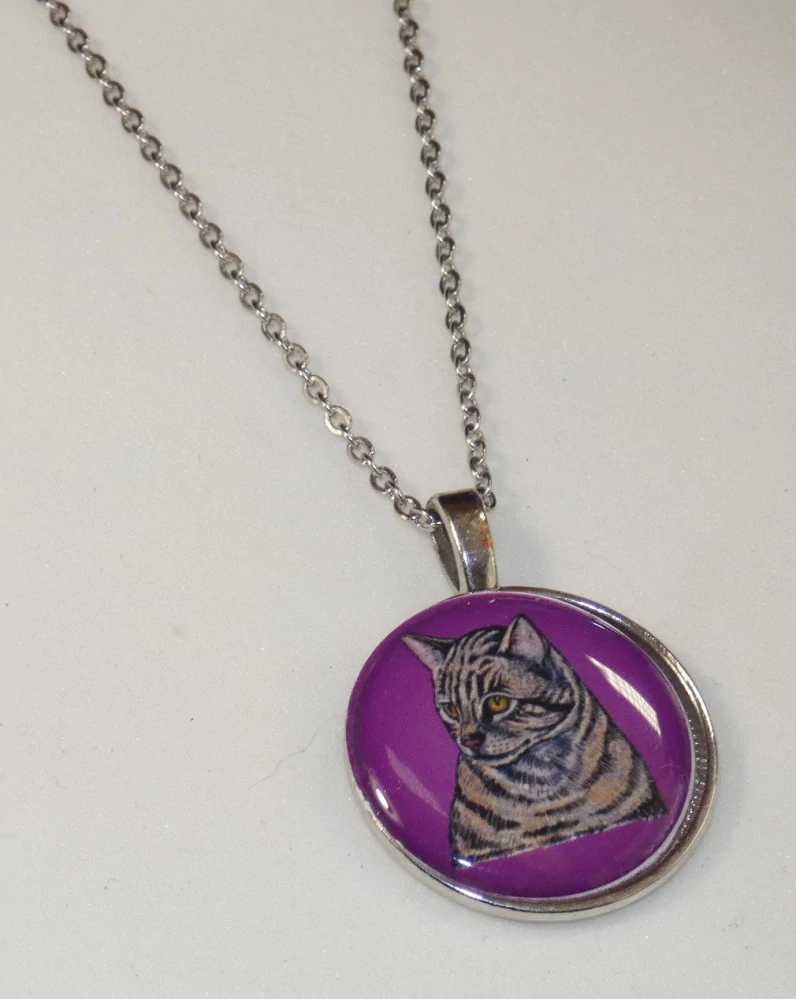 Perokresba mourovaté kočičky s barevným pozadím je na bižuterním lůžku chráněna 3D epoxy pryskyřicí, která je nerozbitná a lehce pruží.