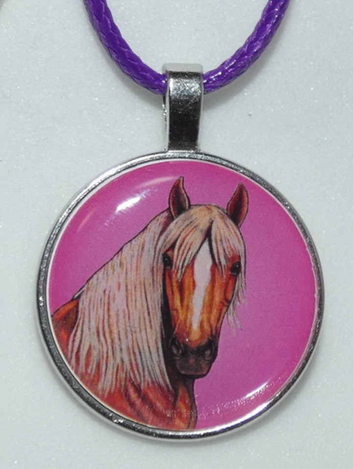 Perokresba koně plemene Hafling s barevným pozadím je na bižuterním lůžku chráněna 3D epoxy pryskyřicí, která je nerozbitná a lehce pruží.