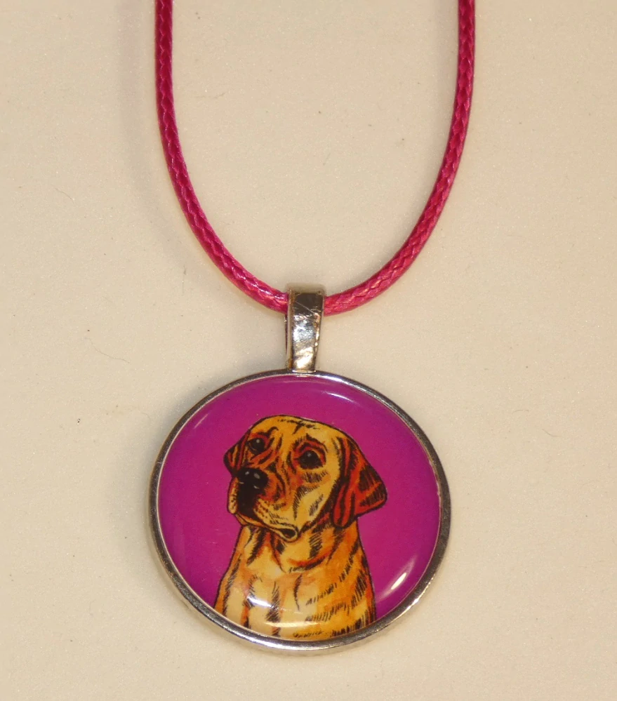 Barevná perokresba labradorského retrívra je na bižuterním lůžku chráněna 3D epoxy pryskyřicí, která je nerozbitná a lehce pruží.