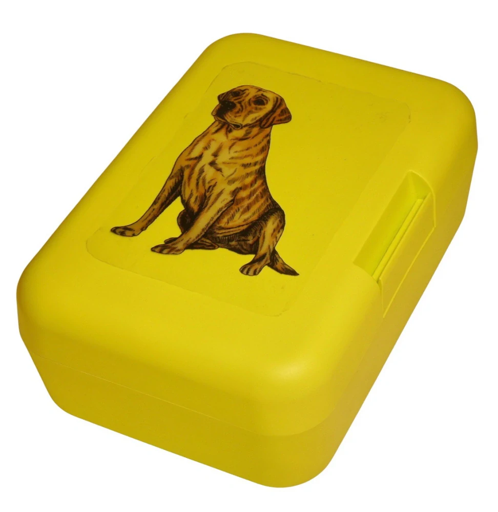 Plastový svačinový box s barevným potiskem labradorského retrievera. Vhodný k uložení nejen klasické svačiny, ale i dalších potravin jako např. sušeného ovoce a oříšků, sušenek a jiných dobrot. Svou velikostí je velmi vhodný dětem do školních aktovek a batohů, do školy i na výlety.