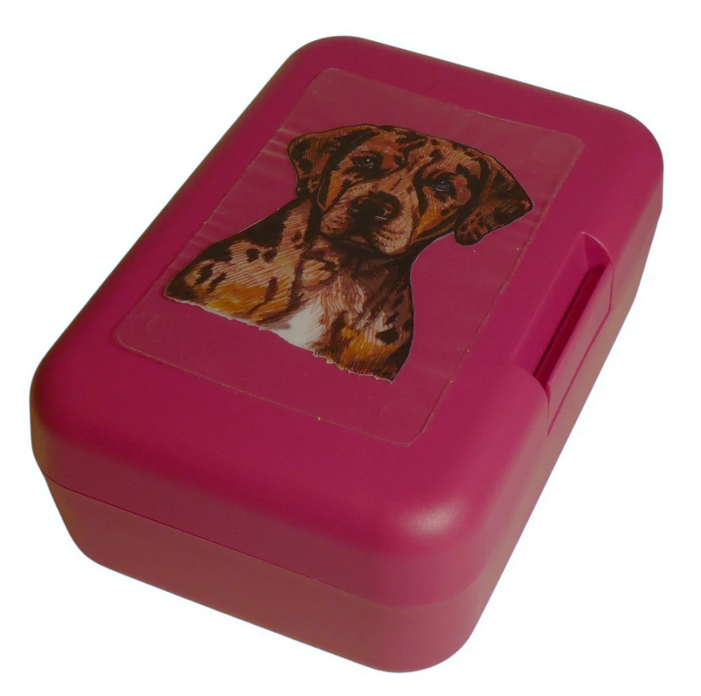 Plastový svačinový box s barevným potiskem Louisianského leopardího psa. Vhodný k uložení nejen klasické svačiny, ale i dalších potravin jako např. sušeného ovoce a oříšků, sušenek a jiných dobrot. Svou velikostí je velmi vhodný dětem do školních aktovek a batohů, do školy i na výlety.