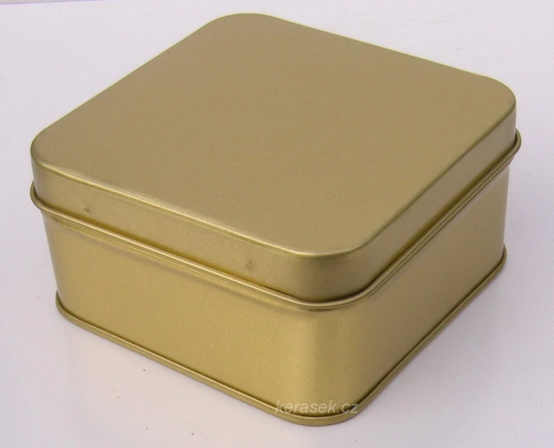 Menší dóza stříbrné nebo zlaté barvy ve tvaru čtverce, víčko není na pantíky, bez potisku nebo s možností vlastního potisku. Vnitřní prostor je určen pro 6-9 kusů balených pralinek, nebo pro bonbony, či sypané čaje, kávu, koření. Nebo pro drobné pamlsky pro pejsky.