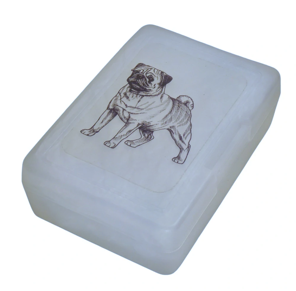 Plastový svačinový box s potiskem mopse (pug). Vhodný k uložení nejen klasické svačiny, ale i dalších potravin jako např. sušeného ovoce a oříšků, sušenek a jiných dobrot. Svou velikostí je velmi vhodný dětem do školních aktovek a batohů, do školy i na výlety.