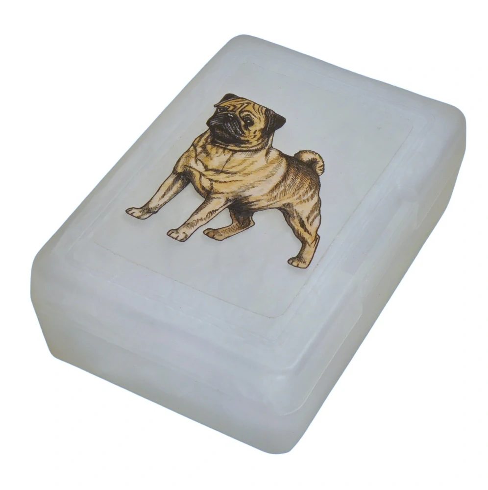 Plastový svačinový box s barevným potiskem mopse (pug). Vhodný k uložení nejen klasické svačiny, ale i dalších potravin jako např. sušeného ovoce a oříšků, sušenek a jiných dobrot. Svou velikostí je velmi vhodný dětem do školních aktovek a batohů, do školy i na výlety.