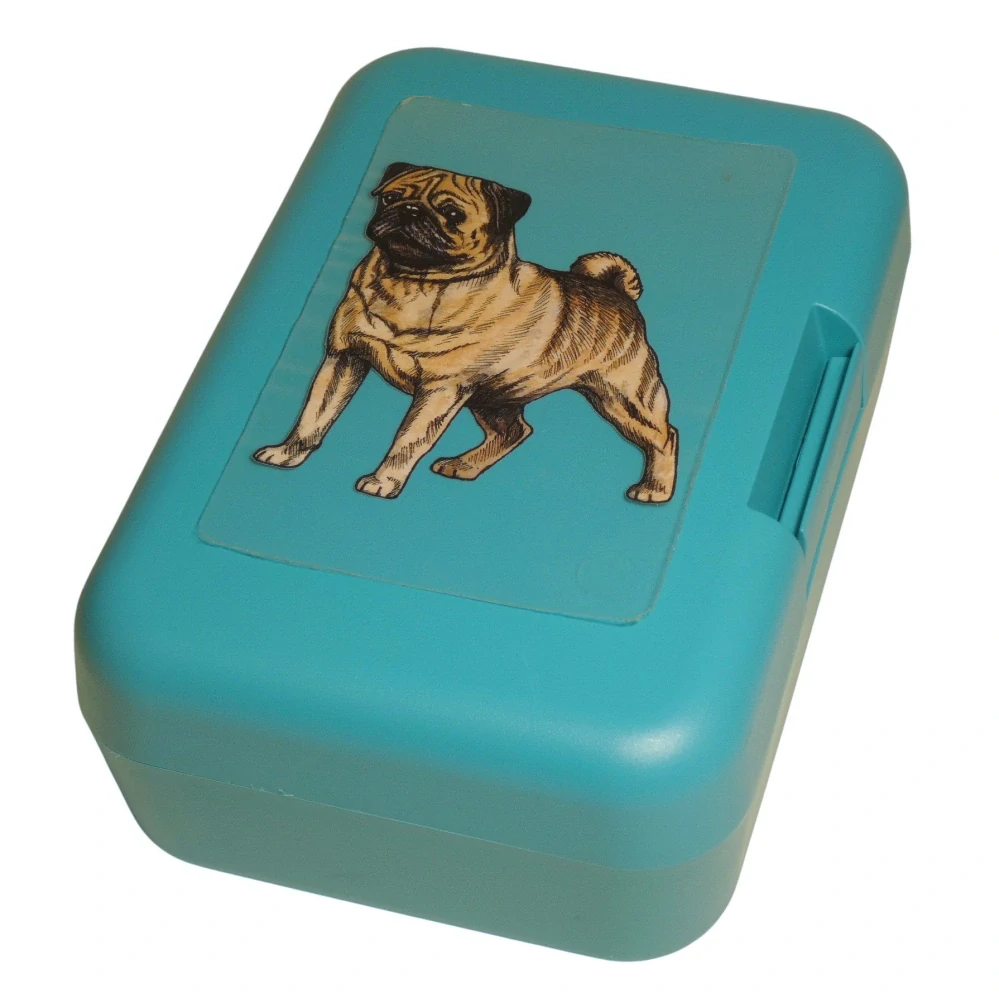 Plastový svačinový box s barevným potiskem mopse (pug). Vhodný k uložení nejen klasické svačiny, ale i dalších potravin jako např. sušeného ovoce a oříšků, sušenek a jiných dobrot. Svou velikostí je velmi vhodný dětem do školních aktovek a batohů, do školy i na výlety.