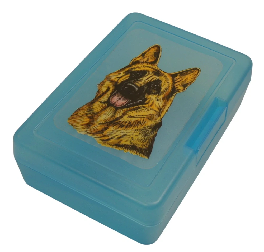 Plastový svačinový box s barevným potiskem německého ovčáka. Vhodný k uložení nejen klasické svačiny, ale i dalších potravin jako např. sušeného ovoce a oříšků, sušenek a jiných dobrot. Svou velikostí je velmi vhodný dětem do školních aktovek a batohů, do školy i na výlety.