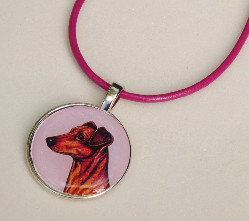 Barevná perokresba psa plemene německý pinč s barevným pozadím je na bižuterním lůžku chráněna 3D epoxy pryskyřicí, která je nerozbitná a lehce pruží.