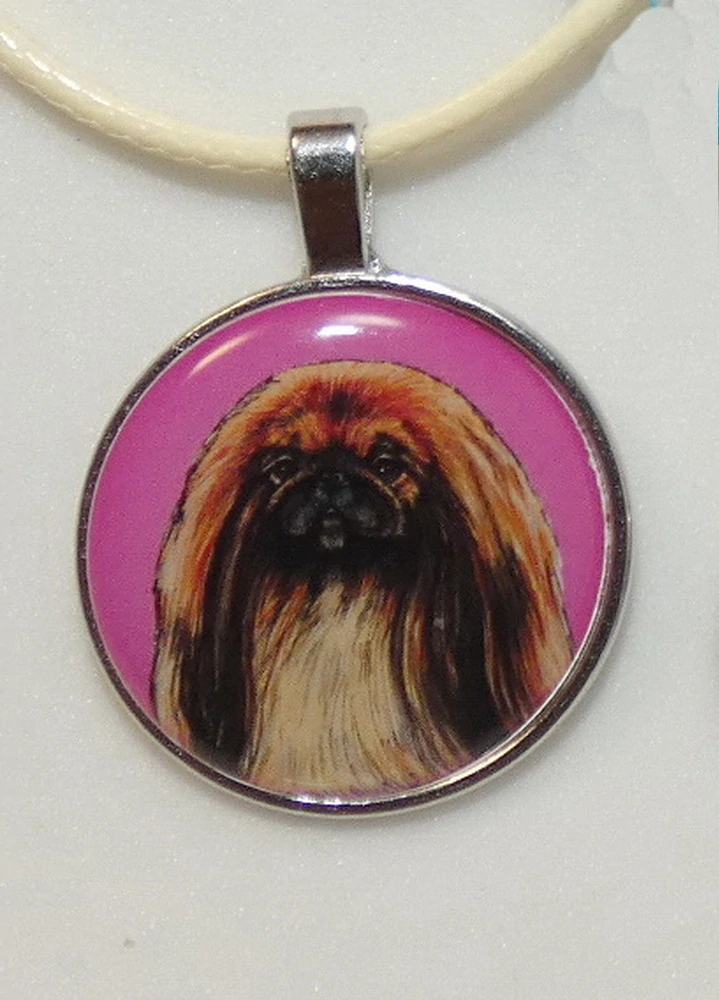 Barevná perokresba psa plemene pekingský palácový psík s barevným pozadím je na bižuterním lůžku chráněna 3D epoxy pryskyřicí, která je nerozbitná a lehce pruží.