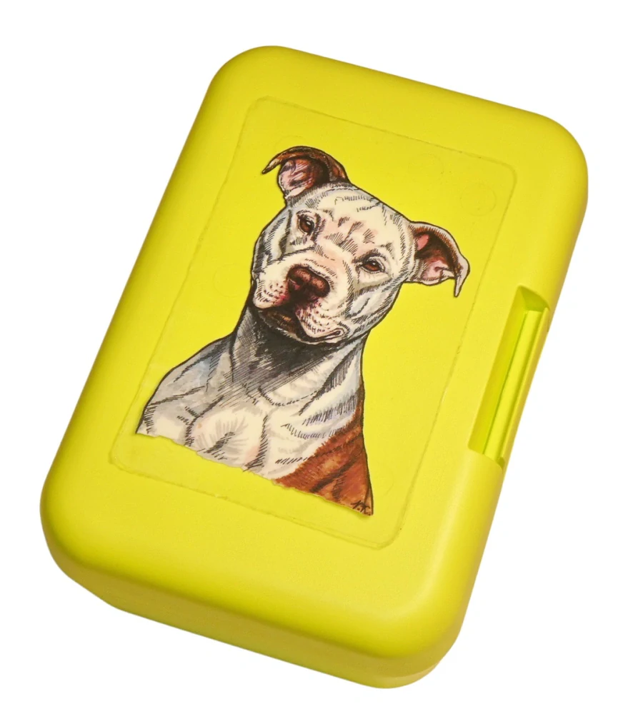 Plastový svačinový box s barevným potiskem americký pitbulteriér. Vhodný k uložení nejen klasické svačiny, ale i dalších potravin jako např. sušeného ovoce a oříšků, sušenek a jiných dobrot. Svou velikostí je velmi vhodný dětem do školních aktovek a batohů, do školy i na výlety.