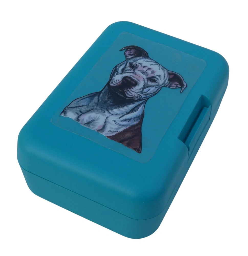 Plastový svačinový box s barevným potiskem americký pitbulteriér. Vhodný k uložení nejen klasické svačiny, ale i dalších potravin jako např. sušeného ovoce a oříšků, sušenek a jiných dobrot. Svou velikostí je velmi vhodný dětem do školních aktovek a batohů, do školy i na výlety.