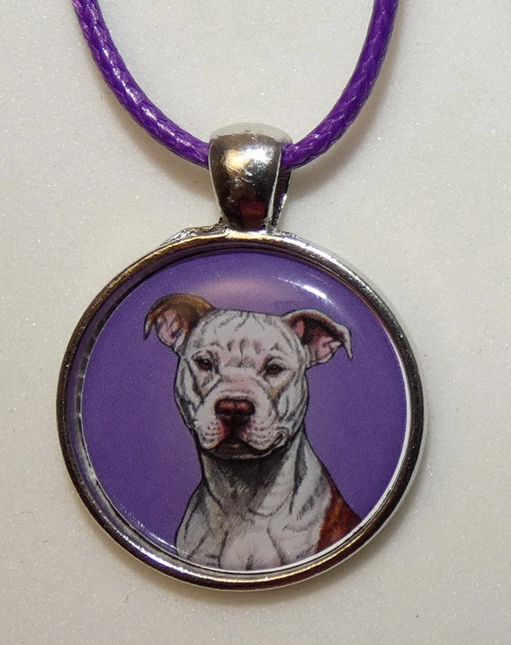 Barevná perokresba psa plemene americký pitbulteriér s barevným pozadím je na bižuterním lůžku chráněna 3D epoxy pryskyřicí, která je nerozbitná a lehce pruží.