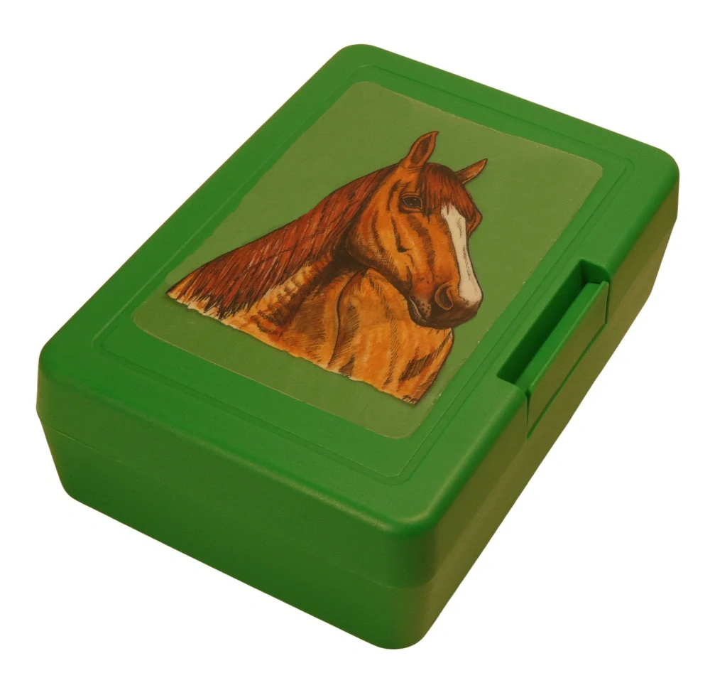 Plastový svačinový box s barevným potiskem koně plemene Quarter horse. Vhodný k uložení nejen klasické svačiny, ale i dalších potravin jako např. sušeného ovoce a oříšků, sušenek a jiných dobrot. Svou velikostí je velmi vhodný dětem do školních aktovek a batohů, do školy i na výlety.