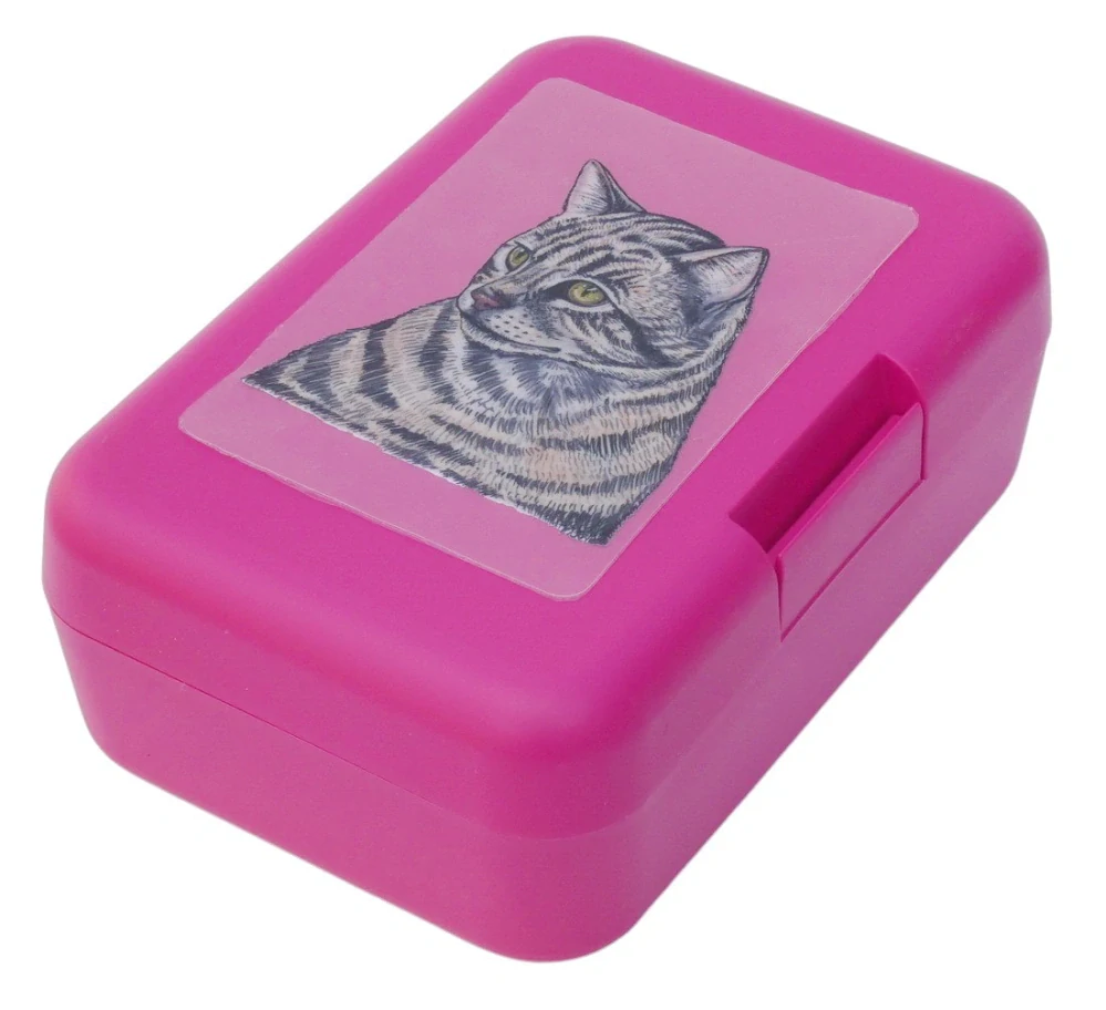 Plastový svačinový box s barevným potiskem mourovaté kočky domácí. Vhodný k uložení nejen klasické svačiny, ale i dalších potravin jako např. sušeného ovoce a oříšků, sušenek a jiných dobrot. Svou velikostí je velmi vhodný dětem do školních aktovek a batohů, do školy i na výlety.