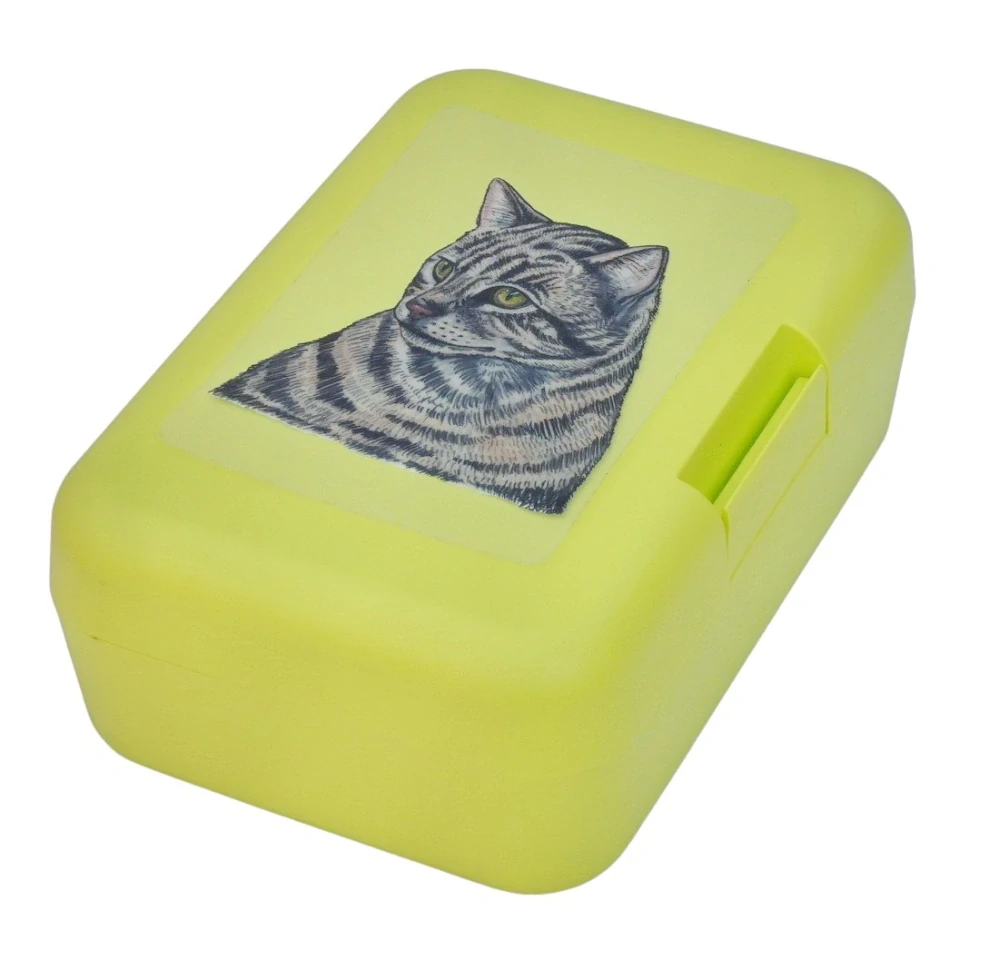 Plastový svačinový box s barevným potiskem mourovaté kočky domácí. Vhodný k uložení nejen klasické svačiny, ale i dalších potravin jako např. sušeného ovoce a oříšků, sušenek a jiných dobrot. Svou velikostí je velmi vhodný dětem do školních aktovek a batohů, do školy i na výlety.