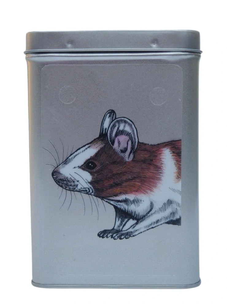 Dóza stříbrné barvy ve tvaru vysokého obdélníku s barevnou perokresbou laboratorní myši. Vnitřní prostor je určen pro cca 20 kusů balených pralinek, nebo pro malé tabulkové čokolády, ořechové tyčinky, či jiné cukrovinky, kávu, čaj. Krabička vhodná na bižuterii či jako netradiční obal na dárek.