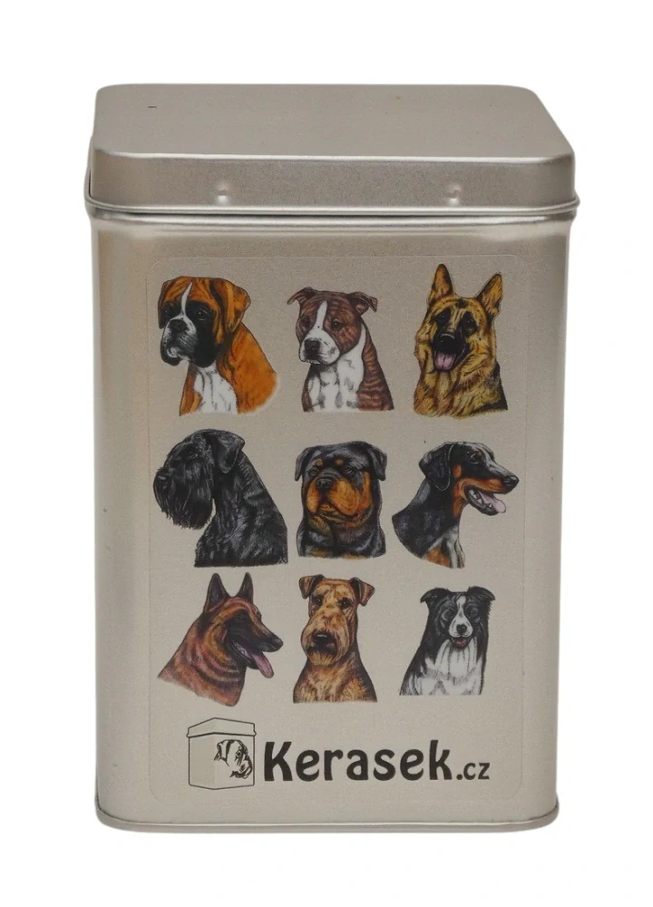 Plechová dóza stříbrné barvy, obdélníkového tvaru s víčkem na pantíky a s barevnou perokresbou 9 plemen psů, která často vídáme na cvičáku, při závodech sportovních plemen - border kolie, boxer, německý ovčák, velký knírač, americký stafordšírský teriér, belgický ovčák - malinois, erdelteriér, rotvajler, dobrman.Vnitřní prostor je určen pro 20 - 30 kusů balených pralinek, nebo pro malé tabulkové čokolády, ořechové tyčinky, či jiné cukrovinky, čaje, bylinky i sušené ovoce a oříšky. Také pro pro vánoční cukroví, perníčky či pamlsky pro pejsky.