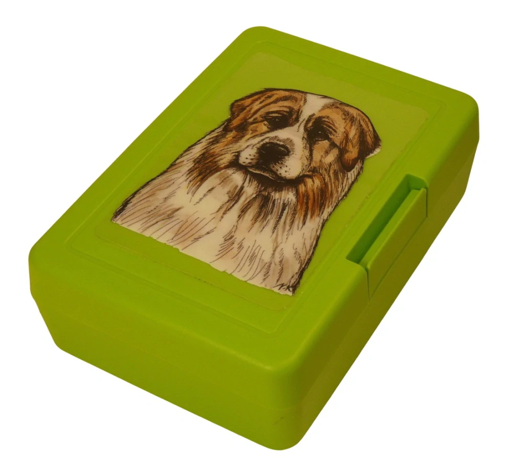 Plastový svačinový box s barevným potiskem pyrenejského horského psa. Vhodný k uložení nejen klasické svačiny, ale i dalších potravin jako např. sušeného ovoce a oříšků, sušenek a jiných dobrot. Svou velikostí je velmi vhodný dětem do školních aktovek a batohů, do školy i na výlety.
