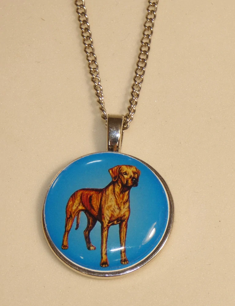 Barevná perokresba rhodéského ridgebacka s barevným pozadím je na bižuterním lůžku chráněna 3D epoxy pryskyřicí, která je nerozbitná a lehce pruží.
