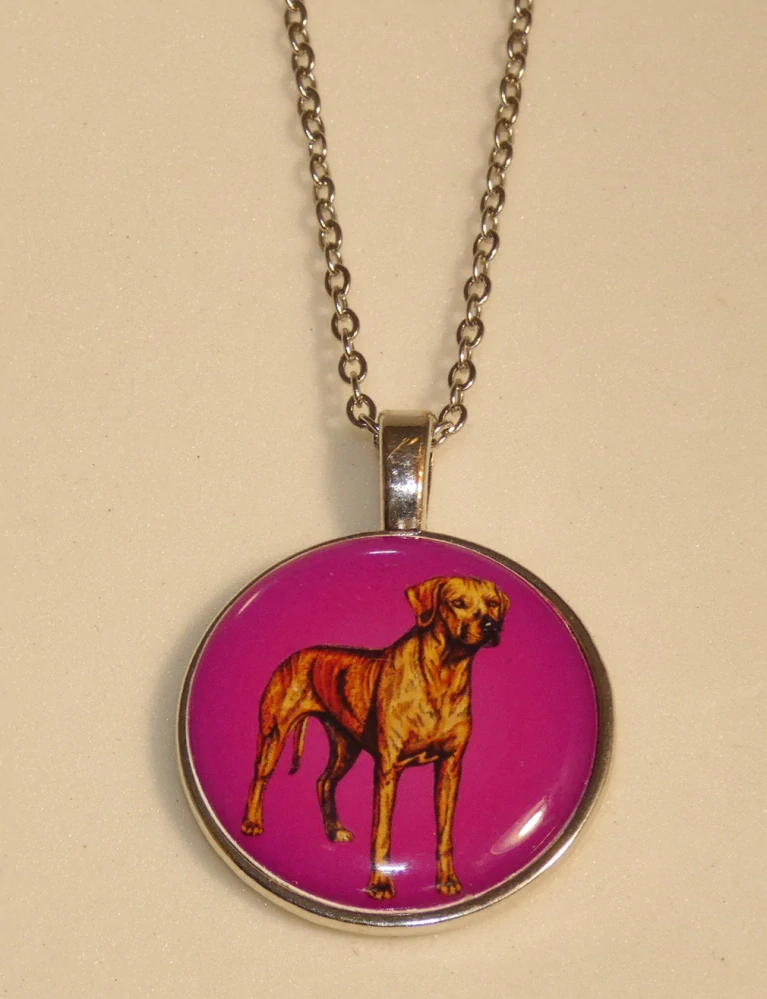 Barevná perokresba rhodéského ridgebacka s barevným pozadím je na bižuterním lůžku chráněna 3D epoxy pryskyřicí, která je nerozbitná a lehce pruží.