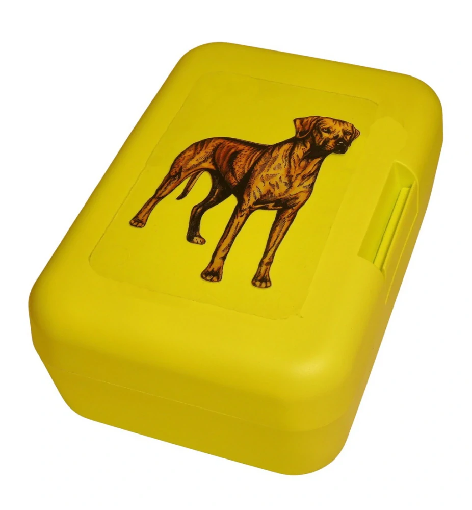 Plastový svačinový box s barevným potiskem rhodéského ridgebacka. Vhodný k uložení nejen klasické svačiny, ale i dalších potravin jako např. sušeného ovoce a oříšků, sušenek a jiných dobrot. Svou velikostí je velmi vhodný dětem do školních aktovek a batohů, do školy i na výlety.