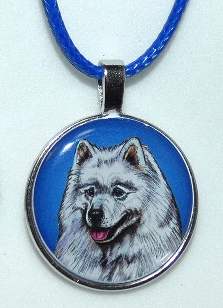 Barevná perokresba psa plemene samojed s barevným pozadím je na bižuterním lůžku chráněna 3D epoxy pryskyřicí, která je nerozbitná a lehce pruží.