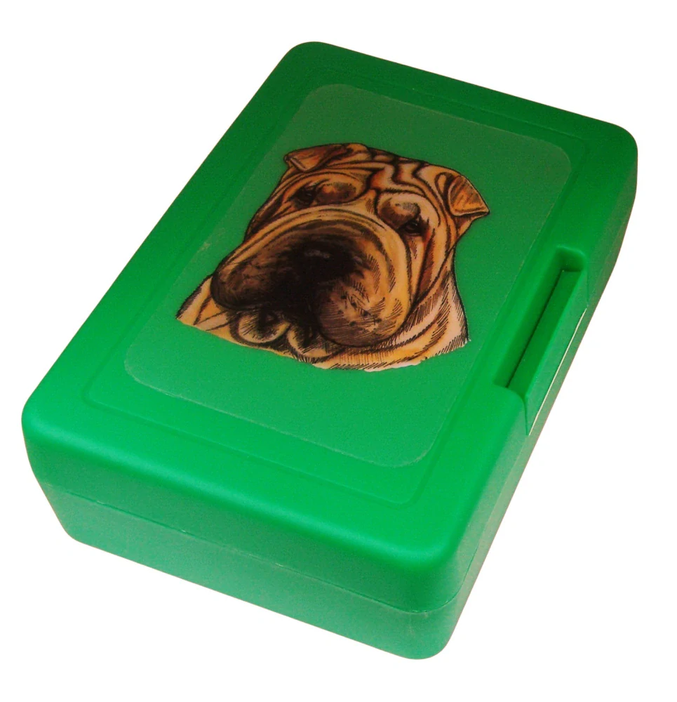 Svačinový box se vyrábí v Německu pod značkou Elasto Form KG z nezávadného plastu (BPA free) a je 100% recyklovatelný. Víčko je na pantíky, ve spodním díle jsou větrací otvory. Shar-pei je natištěn na velmi kvalitní čiré samolepce s matnou laminací.