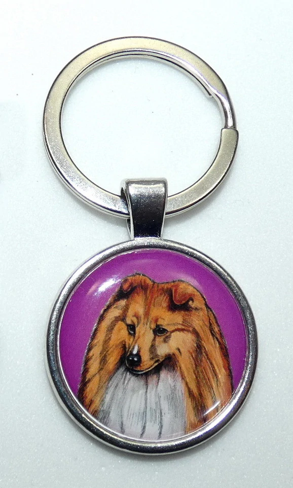 Barevná perokresba šeltie v zlatobílé barvě srsti a s barevným pozadím je na bižuterním lůžku chráněna 3D epoxy pryskyřicí, která je nerozbitná a lehce pruží.