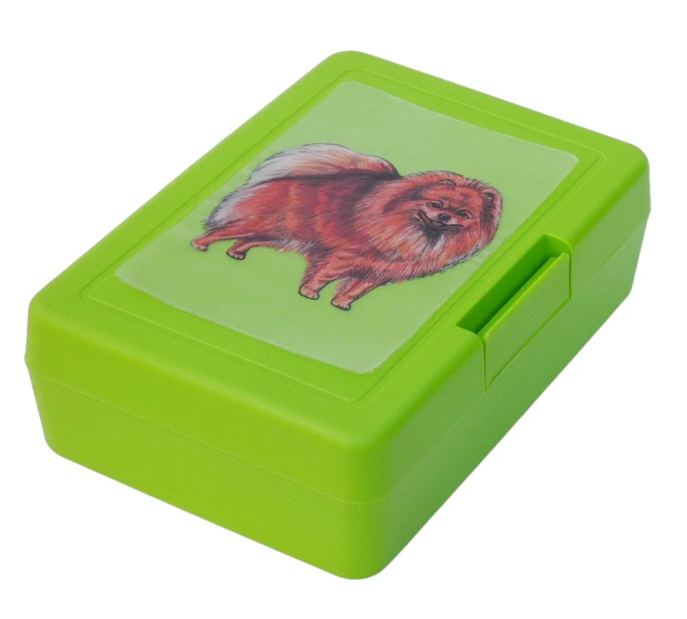 Plastový svačinový box s potiskem německého špice s oranžovou barvou srsti. Boxík je vhodný k uložení nejen klasické svačiny, ale i dalších potravin jako např. sušeného ovoce a oříšků, sušenek a jiných dobrot. Svou velikostí je velmi vhodný dětem do školních aktovek a batohů, do školy i na výlety.