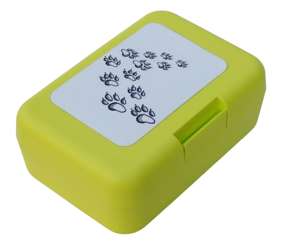 Svačinový box se vyrábí v Německu pod značkou Elasto Form KG z nezávadného plastu (BPA free) a je 100% recyklovatelný. Víčko je na pantíky, ve spodním díle jsou větrací otvory. Tlapky jsou natištěny na velmi kvalitní bílé samolepce s matnou laminací.