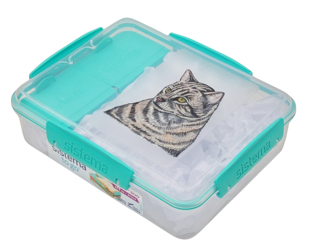 Novozélandská značka Sistema vyrábí svačinové boxy z nezávadného plastu, neobsahují ftaláty, ani BPA. Víčko se sundavá celé, k dóze jej spolehlivě přichytnou 4 plastové barevné klipy. Krabička je rozdělena na 3 části. Jedna větší část a 2 samostatné přihrádky s vlastními víčky v barvě klipu. Obrázek kočky je natištěn na velmi kvalitní čiré samolepce s matnou laminací. Box zatím nabízím v barvě klipu mint.