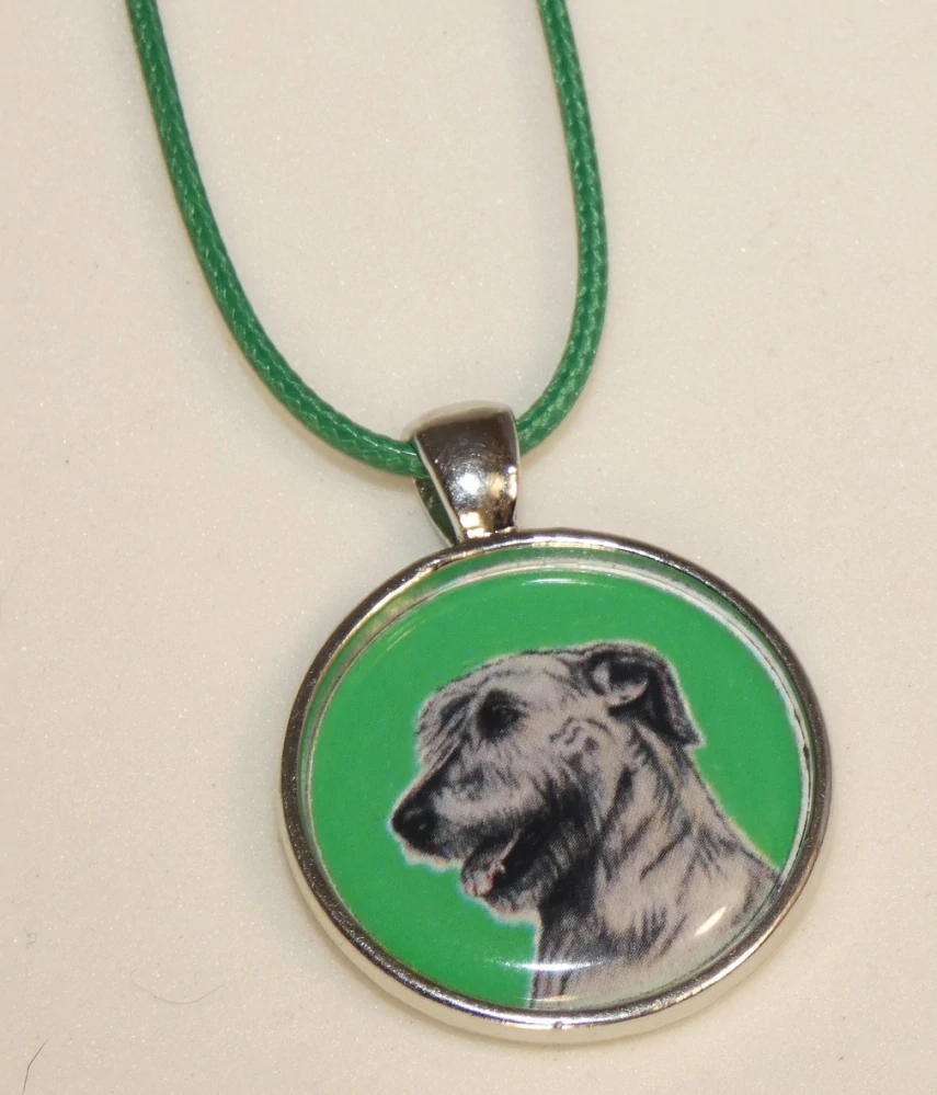 Perokresba irského vlkodava s barevným pozadím je na bižuterním lůžku chráněna 3D epoxy pryskyřicí, která je nerozbitná a lehce pruží.