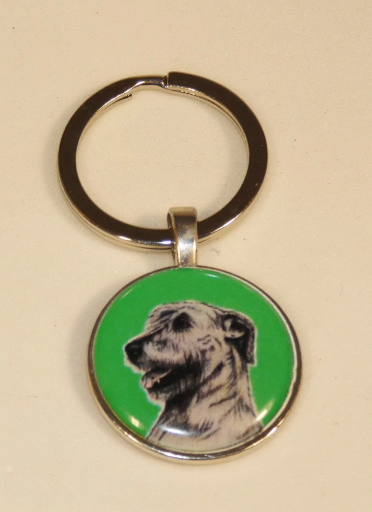 Perokresba irského vlkodava s barevným pozadím je na bižuterním lůžku chráněna 3D epoxy pryskyřicí, která je nerozbitná a lehce pruží.