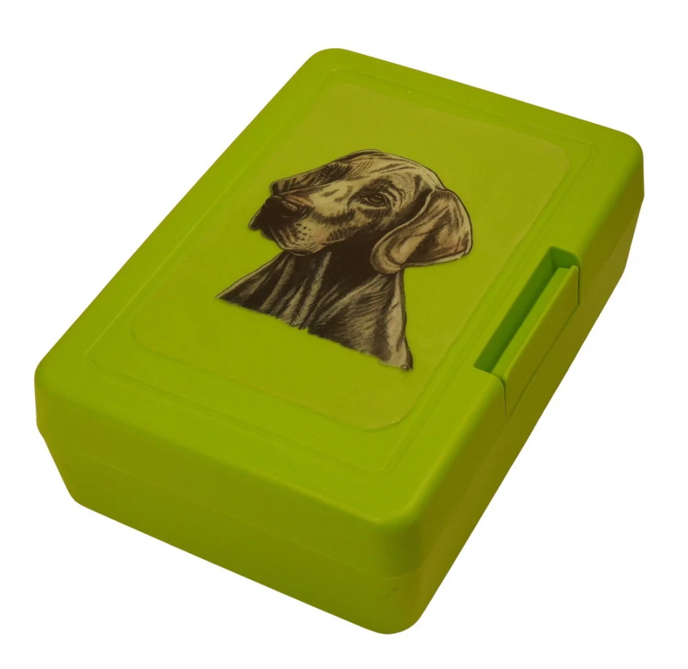 Plastový svačinový box s barevným potiskem výmarského ohaře krátkosrstého. Vhodný k uložení nejen klasické svačiny, ale i dalších potravin jako např. sušeného ovoce a oříšků, sušenek a jiných dobrot. Svou velikostí je velmi vhodný dětem do školních aktovek a batohů, do školy i na výlety.