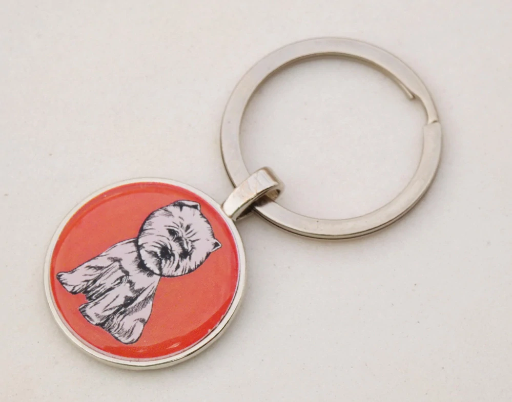 Černobílá perokresba West Highland White teriera s barevným pozadím je na bižuterním lůžku chráněna 3D epoxy pryskyřicí, která je nerozbitná a lehce pruží.
