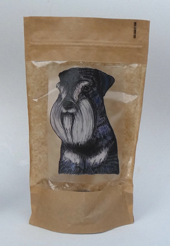 Na přední straně je potisk psa plemene malý knírač. Obrázek psa je natištěn na velmi pevné laminované samolepce.