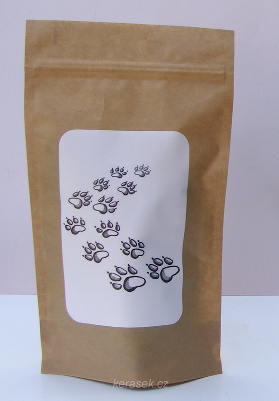 Na přední straně je potisk psích stop na bílém podkladu. Obrázek psa je natištěn na velmi pevné laminované samolepce.