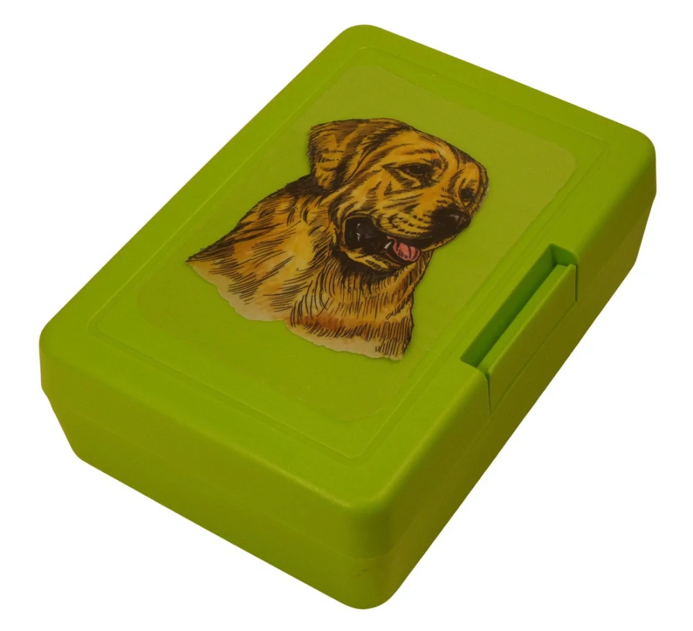Plastový svačinový box s barevným potiskem zlatého retrievera. Vhodný k uložení nejen klasické svačiny, ale i dalších potravin jako např. sušeného ovoce a oříšků, sušenek a jiných dobrot. Svou velikostí je velmi vhodný dětem do školních aktovek a batohů, do školy i na výlety.